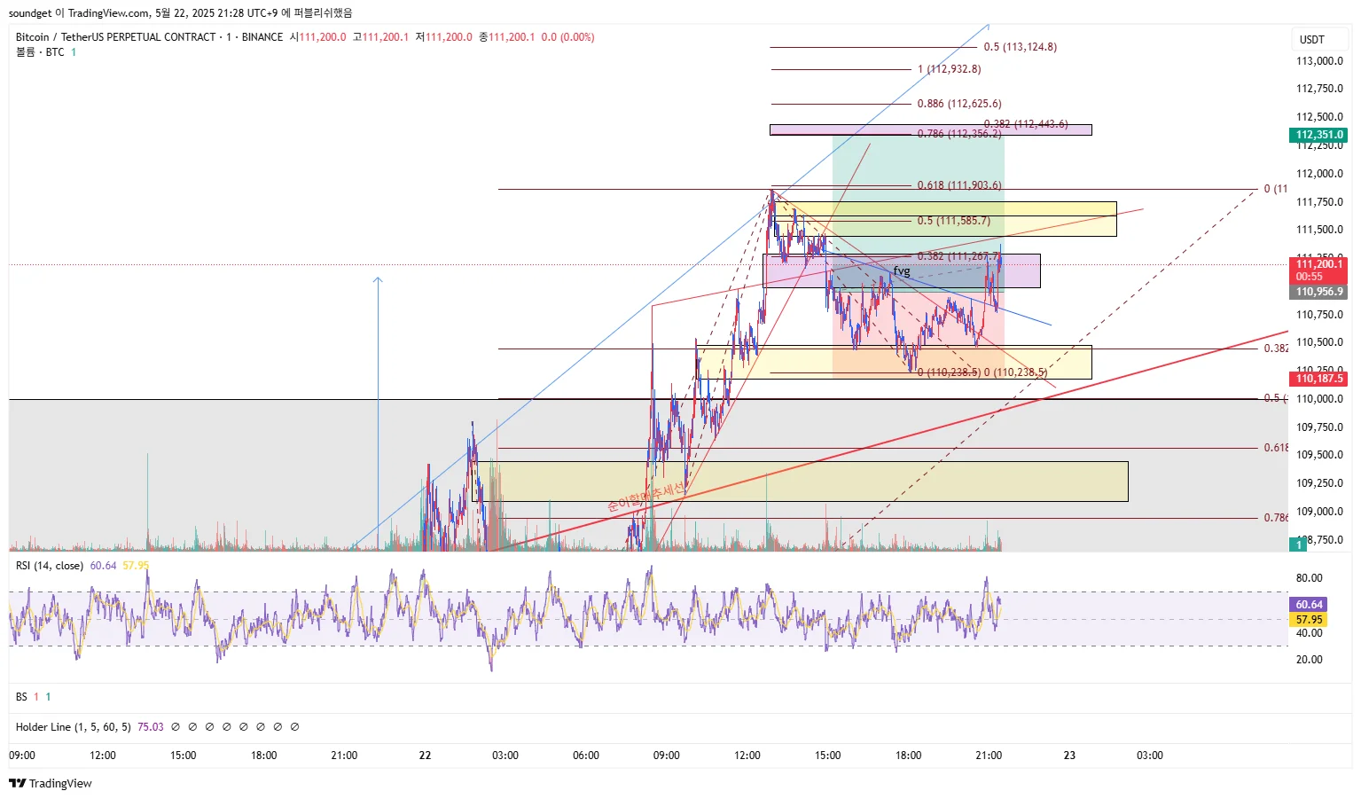 FVG를 깨고 올라간다면 지지받고 추세기반 피보나치 1:1 자리까지(113)까지도 가능하다고 판단