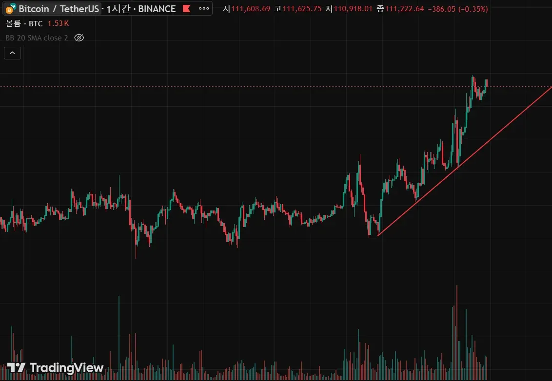 비트코인 1시간봉에서 상승추세선의 지지를 받고 올라가는 비트코인 인거 같습니다!!