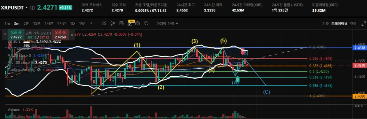 엘리언트파동을 주의깊게 본건아닌데 아는만큼 보이는건지 강의에서 배웠던 이쁜그림이 보여 피보나치를 짰을때 80% 확신이 생겼고 A 파동까지 지켜보다 추세반전을 확인후 피보나치 0.5에서 진입
