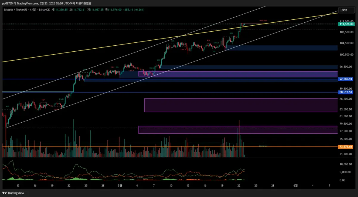 24년 8월 장기 추세선을 돌파후지지로 삼고 있는 모습 4개월동안 조정장이 끝남과 동시에 74k에서 시작된 상승채널 대로 가고있는 모습입니다