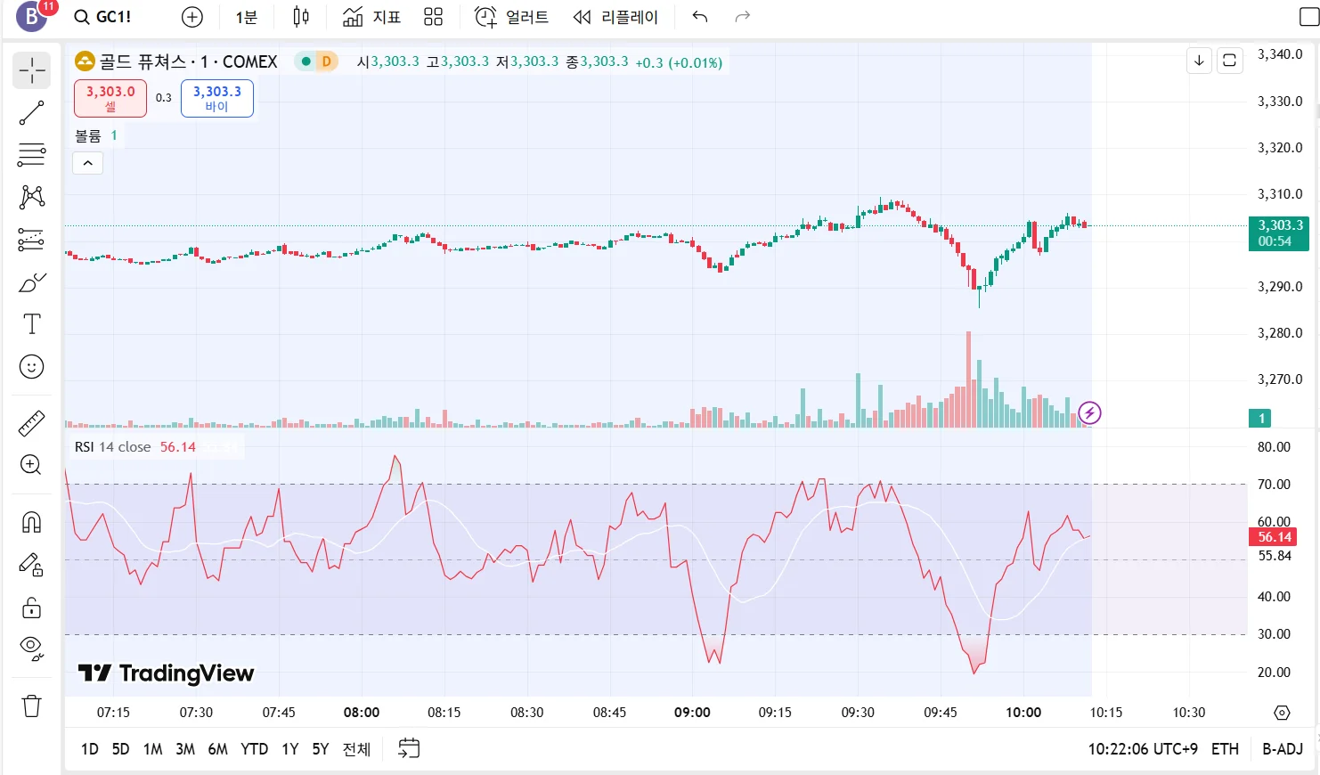 골드 선물 차트에 RSI 지표 추가 해 보았습니다 .