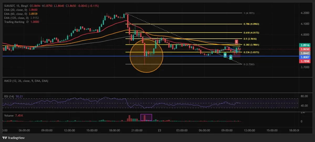 일봉상 상승후 횡보구간으로 15분봉 상 의미있는 거래량 출현 후 저항선 만들어주었으며