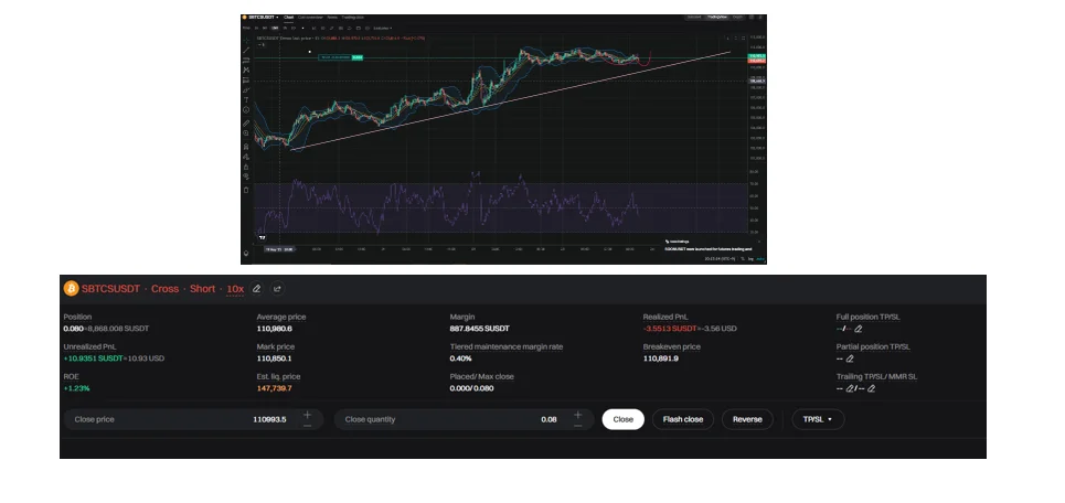 상승장임에도 15분봉에서 역 헤드엔 숄더 패턴이 보여 실제 매매로는 아직 자신이 없어서 모의 트레이딩 진행하고 있습니다. 상승장에 숏은 조금 위험하다 판단되어.. 상승 추세선 부근에도 거의 인접하기 때문에 추세선 부근에서 익절 걸어두었습니다.