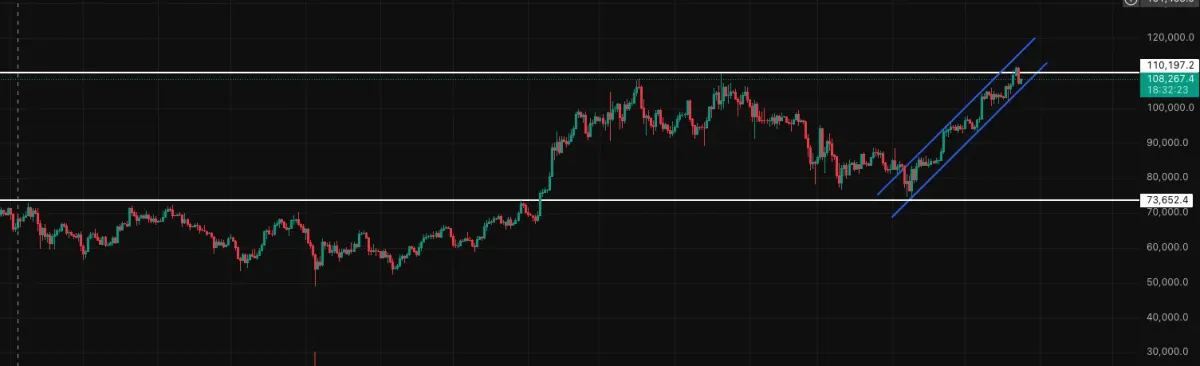 비트코인 4시간봉에서 저항선 돌파 후 지지선으로 변경되는 구간과 최근 신고점을 돌파하는 상승 추세선 작도 해보았습니다.