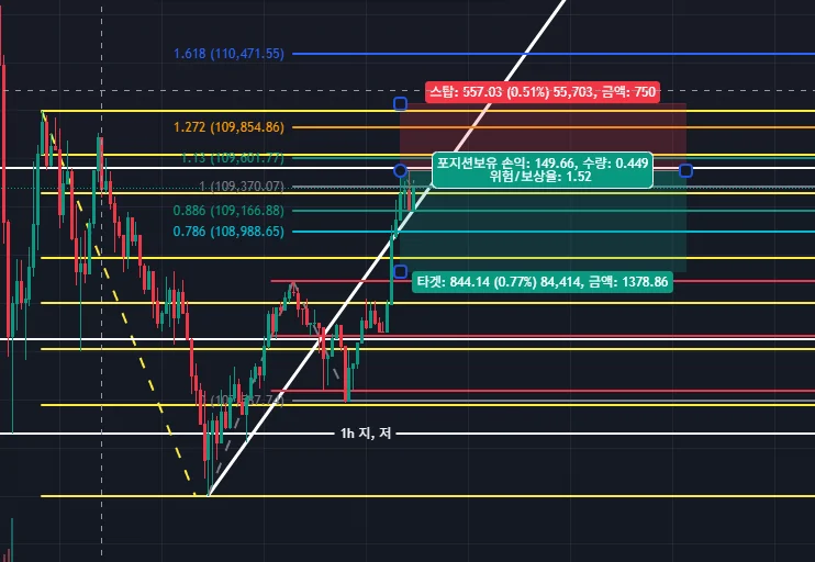 -SL에 맞춰서 1.5까지 늘렸고, 확인해보니 저항선이였던 구간이 지지선이 될 가능성이 높아 그 위에서 익절.
