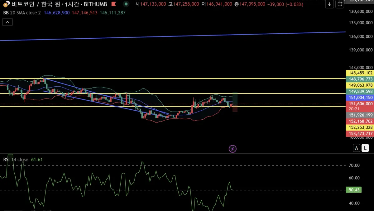 1시간 봉으로 볼린저밴드 축소로 인한 수축구간 예상되어 숏진입하였습니다.