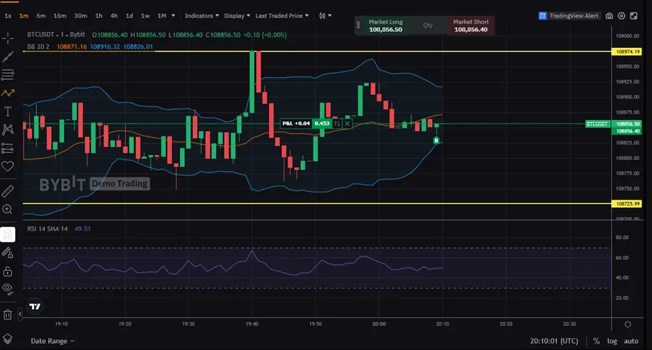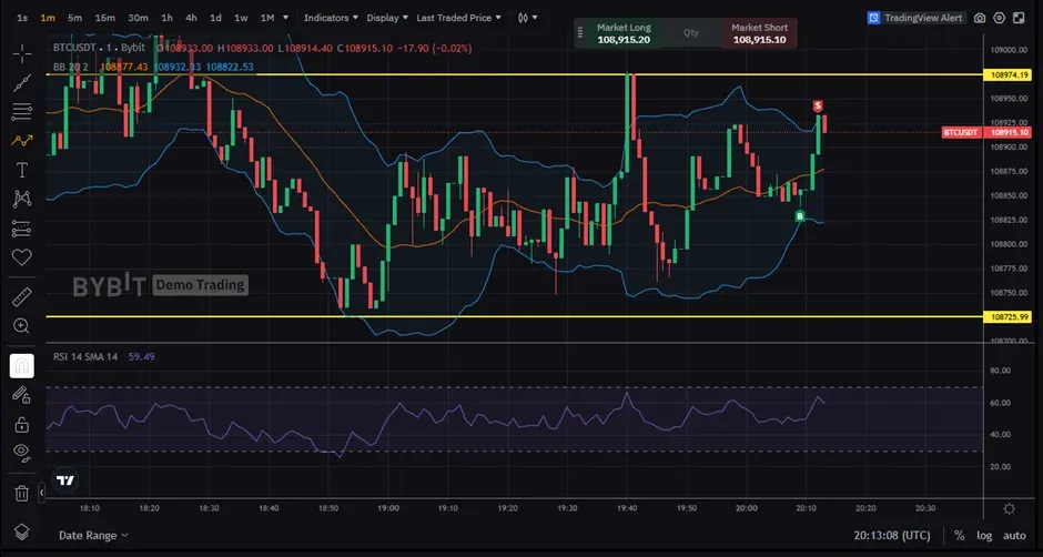 일단 이번 주 미션이 일단 모의 트레이딩을 해서 인증하는 것이였기에 일단 빠른 1분봉에 간단하게 볼린저 밴드와 RSI, 그리고 지지/저항선만 간단하게 그어봤습니다.