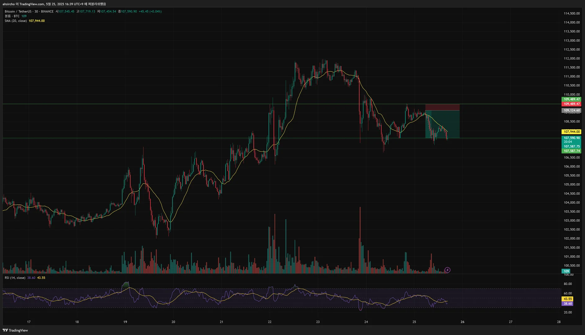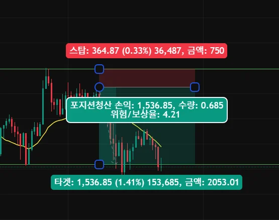 하락 (0)-(A)-(B)-(C) 중 (B)에서 횡보하면서 수렴 중이라 생각되는 지점이 보였고, (C)까지는 몰라도 (A)점까지는 다시 내려갈 거라는 생각이 있어서