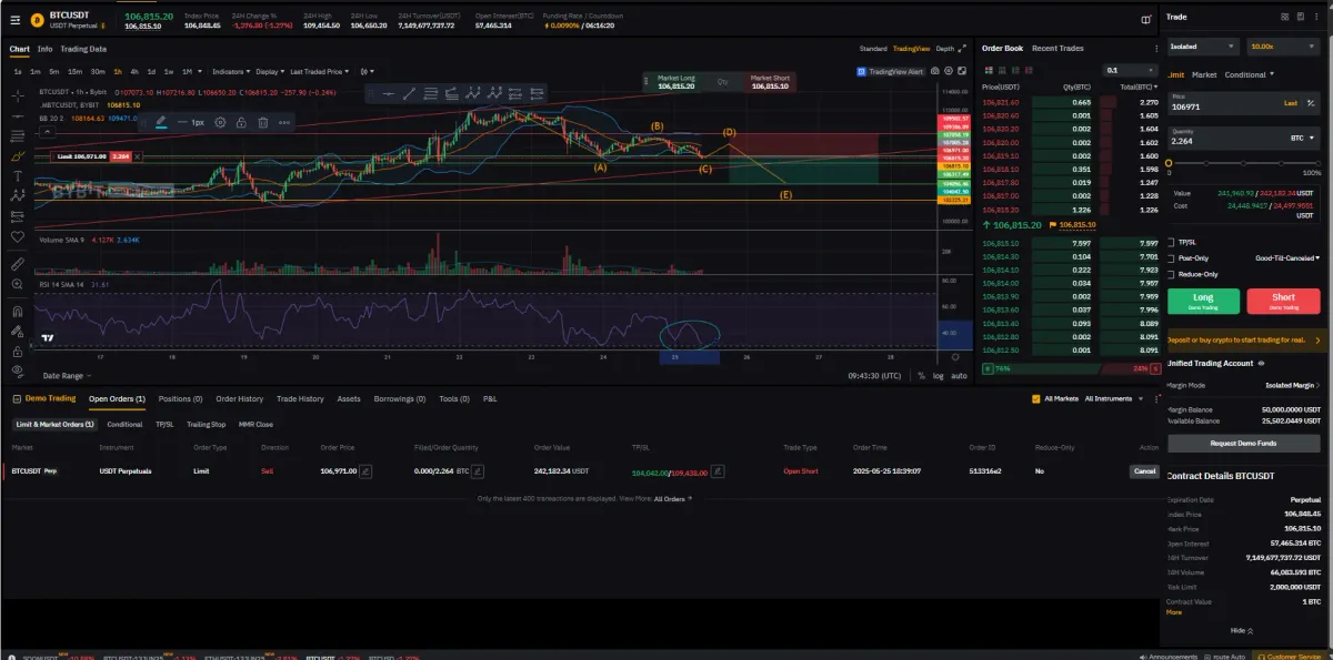 rsi 지표 확인결과 하락 다이버전스 예상되며 엘리어트 파동 이론에 따라 하락을 예상하고 숏 표지션으로 진입했습니다. 손절가 익절가 설정했으며 결과 나오면 다시 한번 공유하겠습니다.!