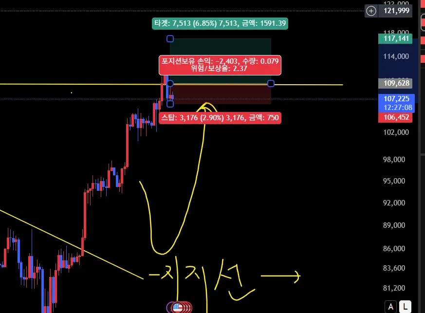 오늘 BK 강사님의 매매 강의를 다시 쭉 정주행하고 BTC 차트를 보여 작도를 하고 Long 포지션 손익비를 잡아 보았습니다.