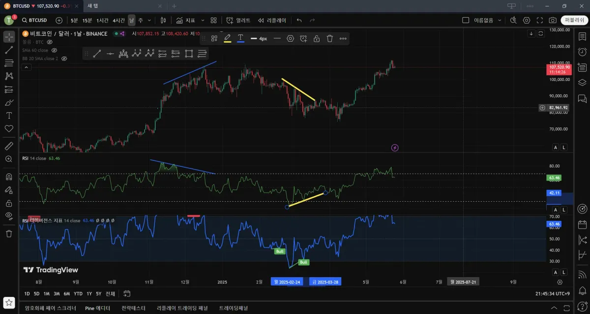 트레이딩뷰에 RSI 다이버전스 지표가 있어서 쉽게 찾았습니다.