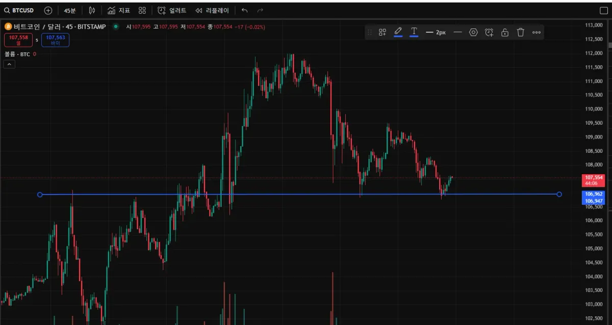 106,962 구간 지지선을 그어 지지받을것으로 예상하고, 소액 수익실현 하였습니다.