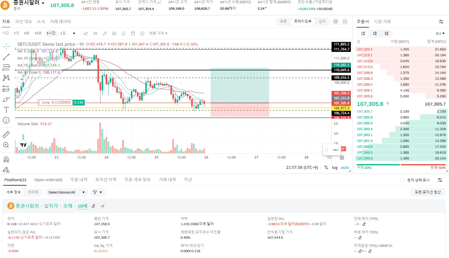 일봉, 4시간봉, 1시간봉 순으로 지지와 저항을 그렸고 1시간봉에서 상승 트렌드 더블탑으로 보이는 패턴을 발견하여 넥라인을 그어서 진입을 하려고 하였으나 진입 시점과 상승 트렌드에서의 더블탑은 넥라인을 맞고 하락을 라는 가능성이 큰데 이를 잘못생각하여 진입을 하였습니다.