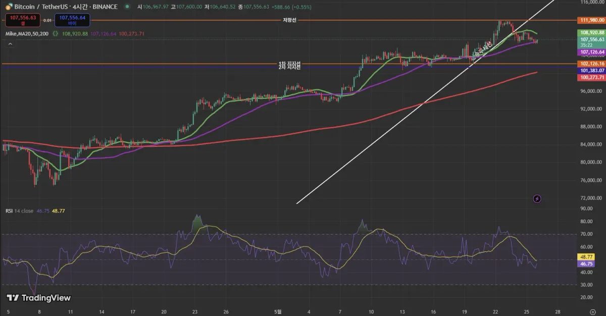 RSI는 가격의 고점은 높아지나 RSI의 고점은 낮아지는 하락 다이버전스를 띄고 있으며