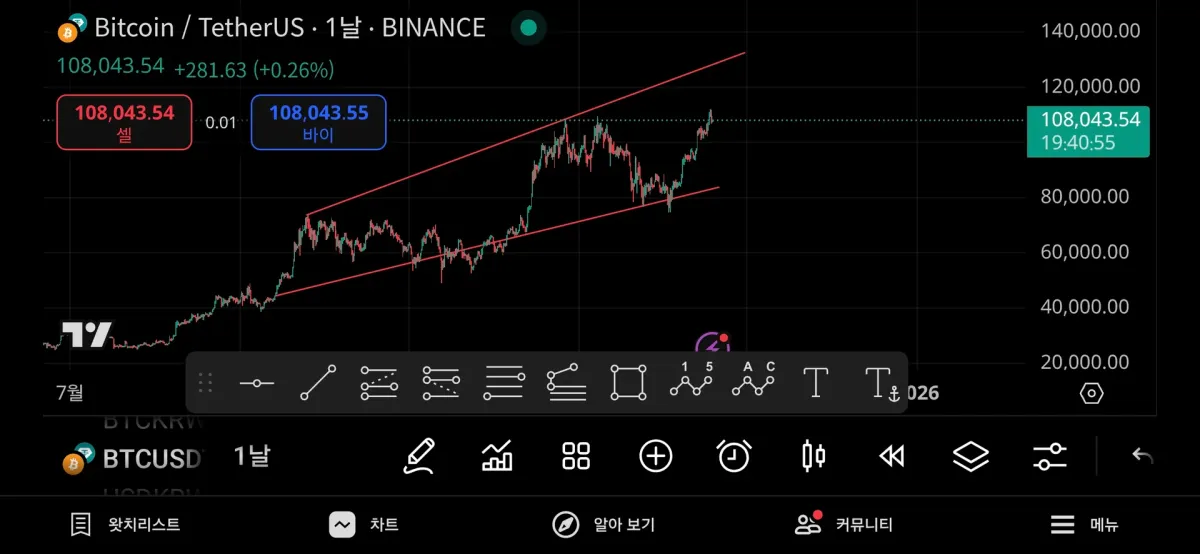 지지선과 저항선이 꾸준한 우상향이고 현재 상승국면 이지만 저항선이 얼마 남지않은 관계로 저 부분을 뚫고 올라갔을때 큰 상승을 기대해봐도 좋지 않을까 생각합니다.