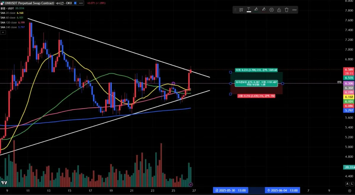 다행히 17:00 이후부터 상승하여 5. 26일 16:00 6.53 가격에 클로즈를 한 매매 였습니다. 앞으로는 반드시 진입시 스탑로스를 걸고 매매를 하겠습니다.