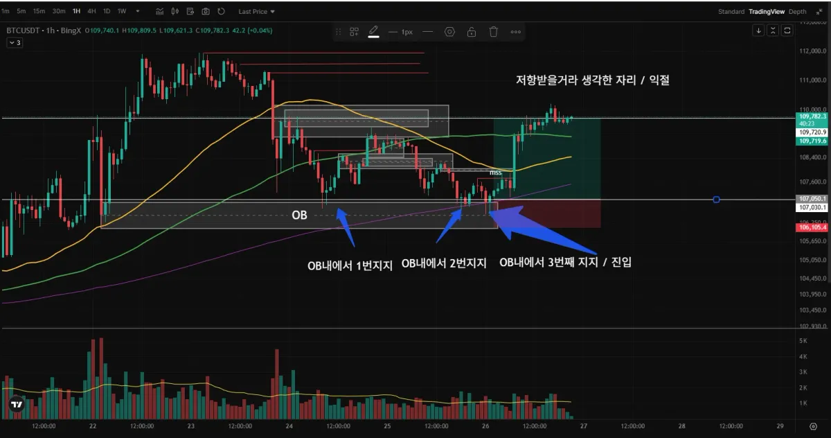 - 하단 오더블록 내에서 3번 지지