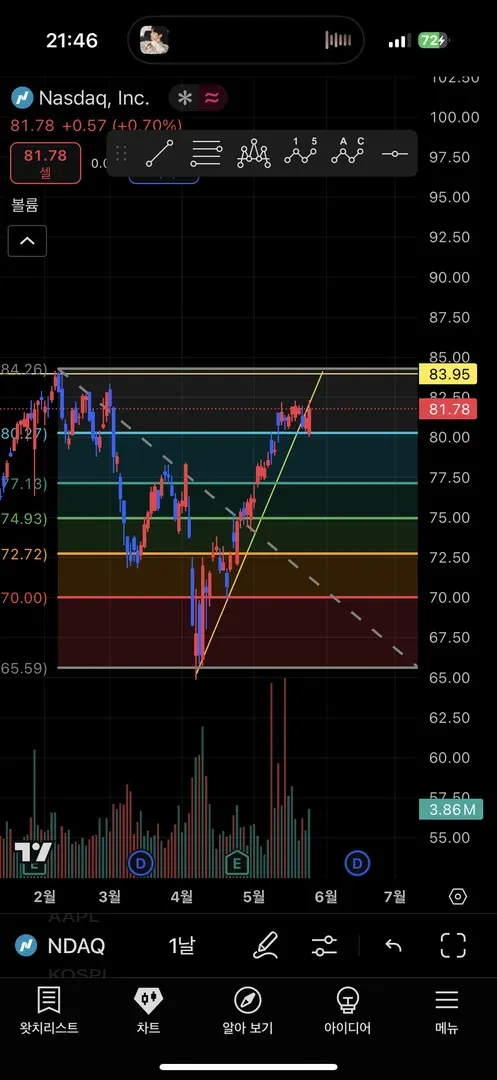 코인이 아닌 주식시작으로 봤고, 추세선과 피보나치의 그랴프를 그렸을 때 살짝 주춤하고 0.786 지지선을 받고 등반 할것으로 보아 진입 했음