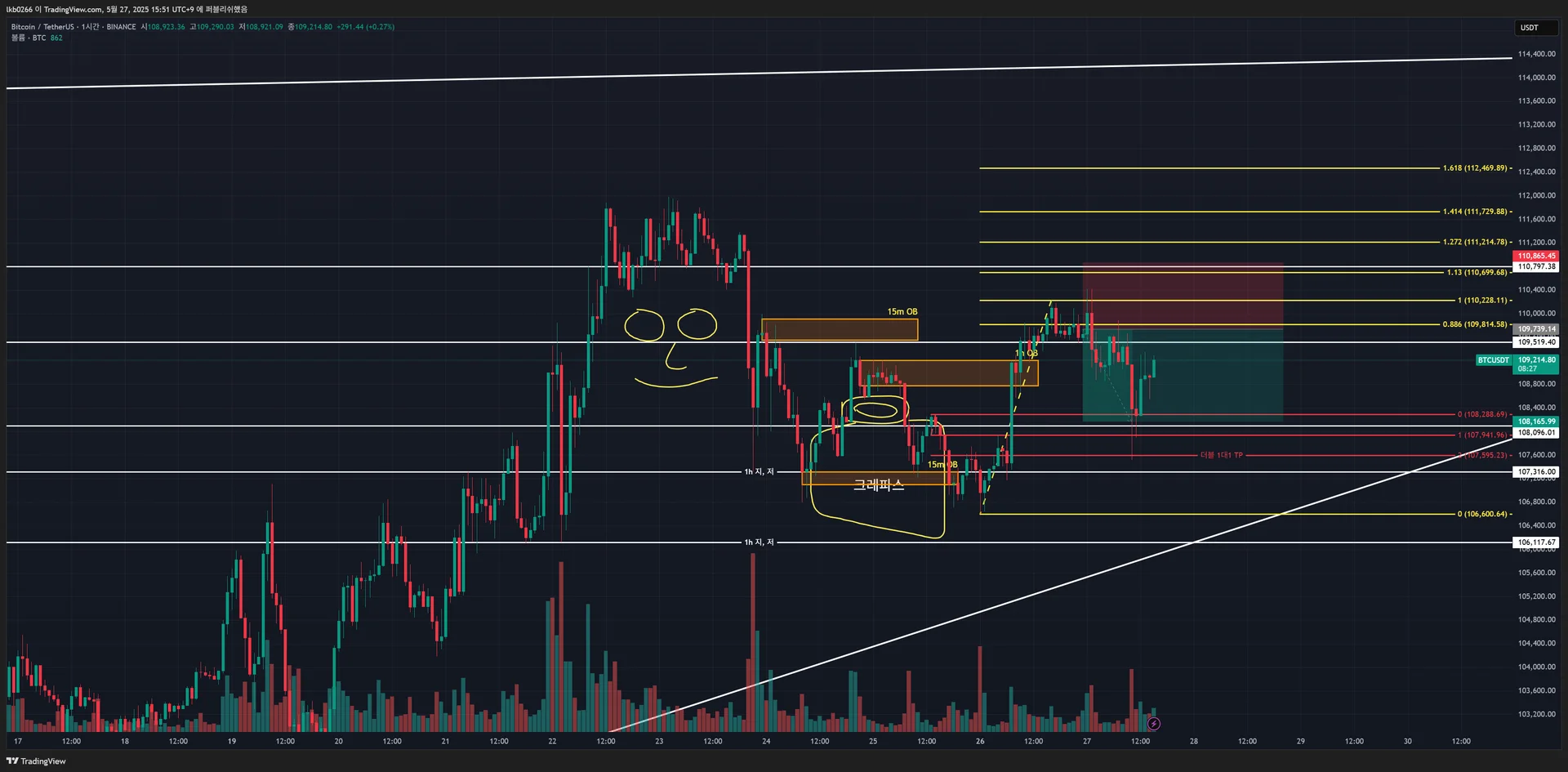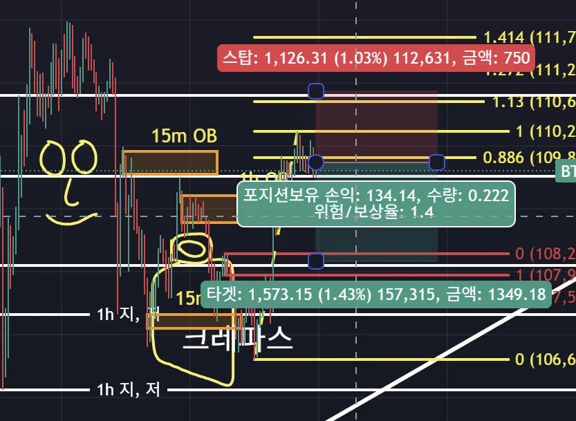 - 만약 고점을 높인다면 저점과 고점을 찍어본 피보나치 1.13 구간과 저항선 위로 SL 잡음