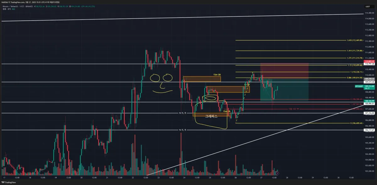 • 만약 고점을 높인다면 저점과 고점을 찍어본 피보나치 1.13 구간과 저항선 위로 SL 잡음