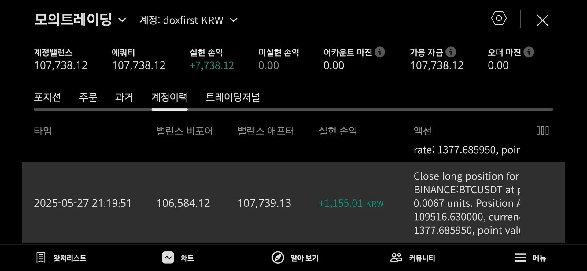 삼각 수렴을 확인 하고 추세선 까지 Long 진입 추세선에 만나는 지점에서 포지션 종료