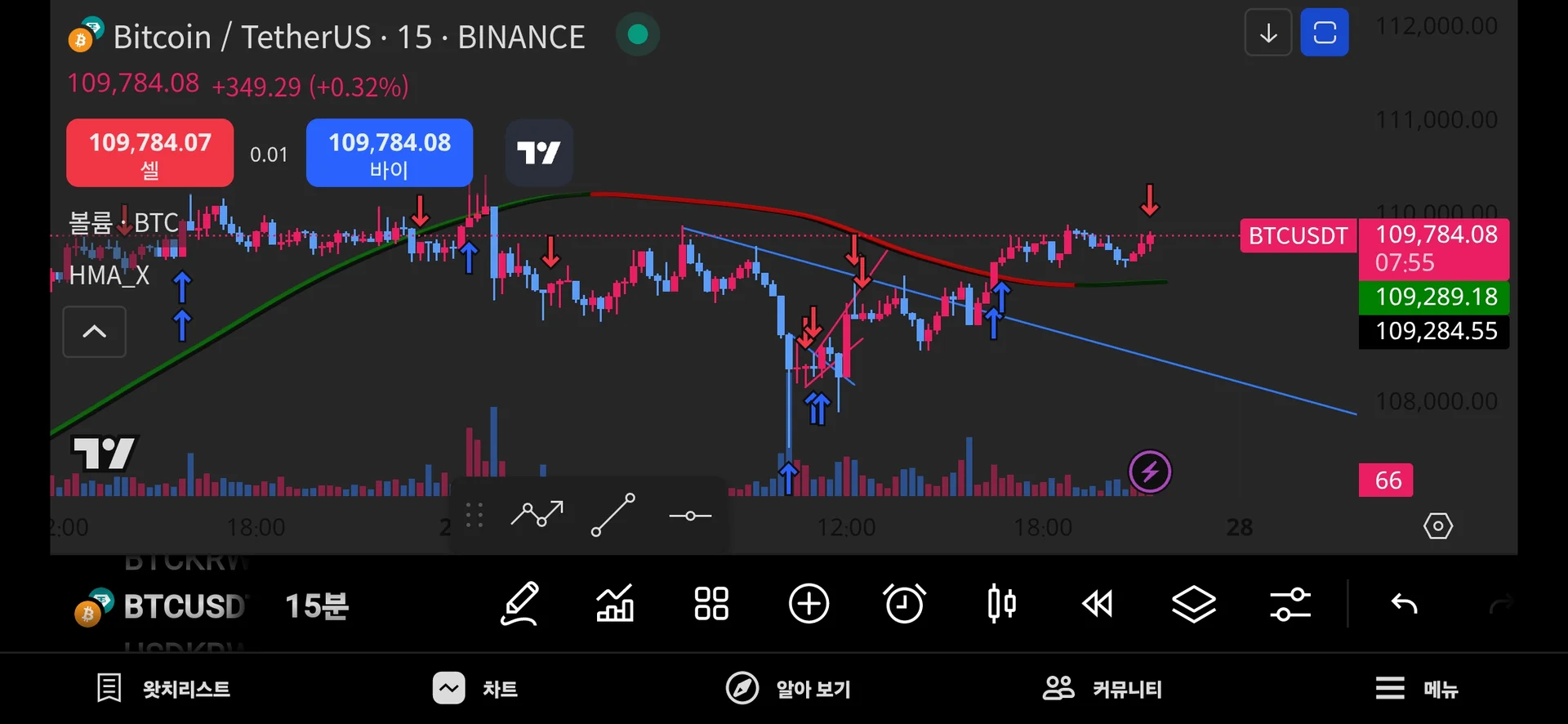 후에 short 2차 진입 하였으나 추세선 돌파에서 포지션 종료를 결정하지 못해서 손절