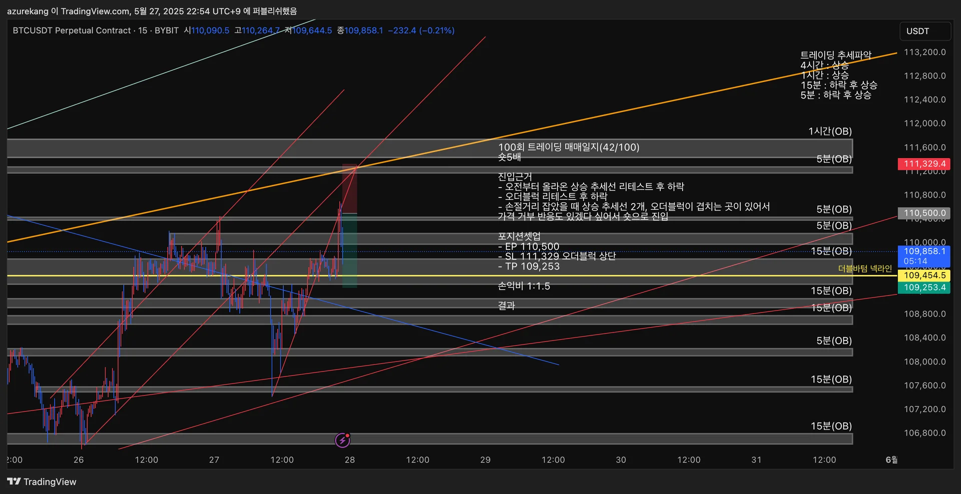 - 손절거리 잡았을 때 상승 추세선 2개, 오더블럭이 겹치는 곳이 있어서
