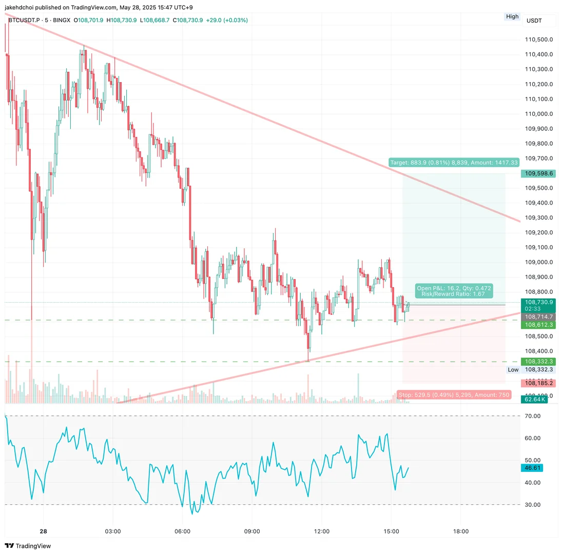 - 108.6k에서 강한 반등 이후 지지