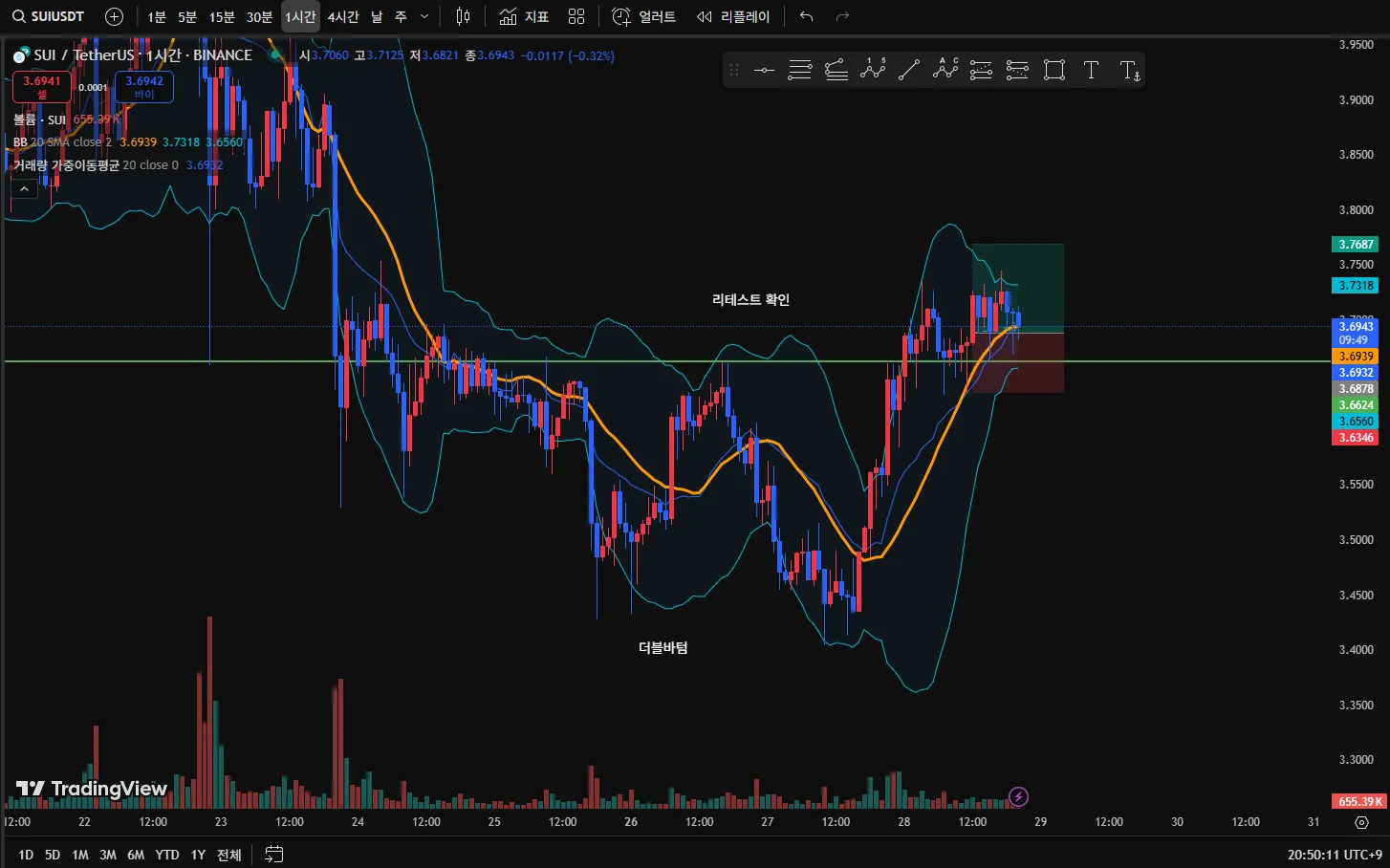 전 수이 코인의 1시간을 봉을 지켜보다 더블 바텀 패턴 형성 후 넥라인 돌파하는 것을 확인하였습니다.