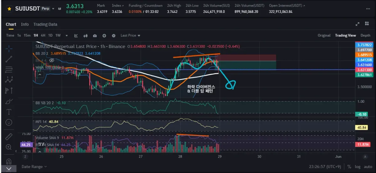 수이 1시간 봉을 봤을 때, 더블 탑 패턴 형성과 함께 하락 다이버전스 확인하여 봉 마감 이후 진입.