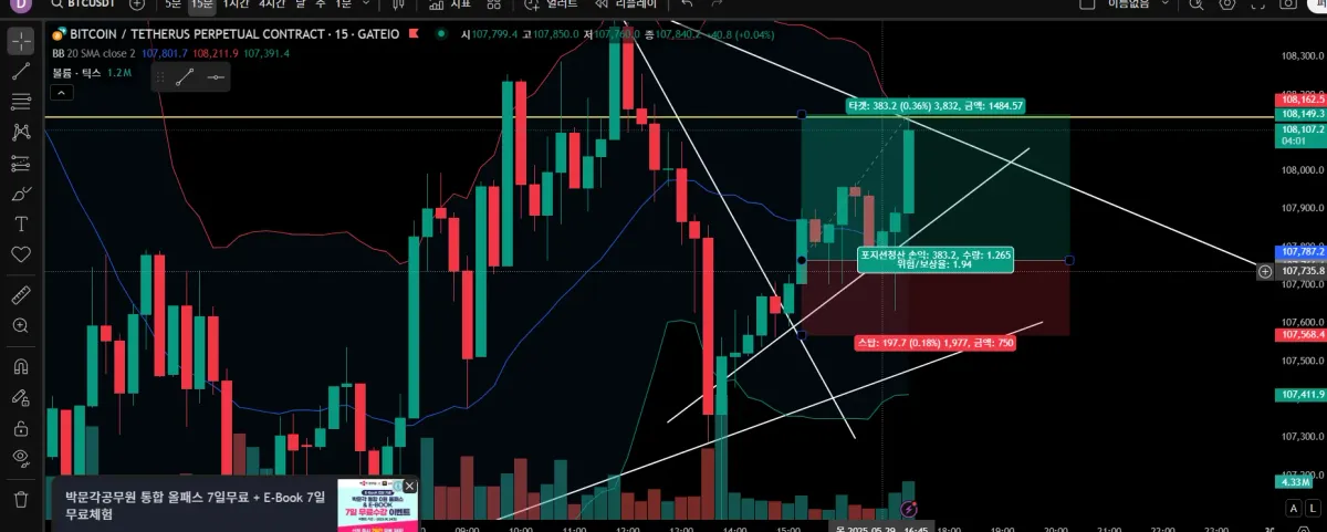 5분봉과, 15분봉, 1시간봉을 보고 추세선을 그려보았으며, 초반 5분봉 기준으로 그린 짧은 삼각 수렴 부분을 하락 웨지로 판단하여 추세저항선을 이탈할 시에 큰 상승 폭을 그릴 것으로 예상하여, 15분봉 기준 2개 캔들이 장대 양봉을 그리는 것을 확인하고 5분봉 볼린저밴드 상으로 20일 이평선 위를 지나며 볼린저밴드 상단선을 터치하는 것을 확인하여 상승 추세로 판단, 진입하였습니다.