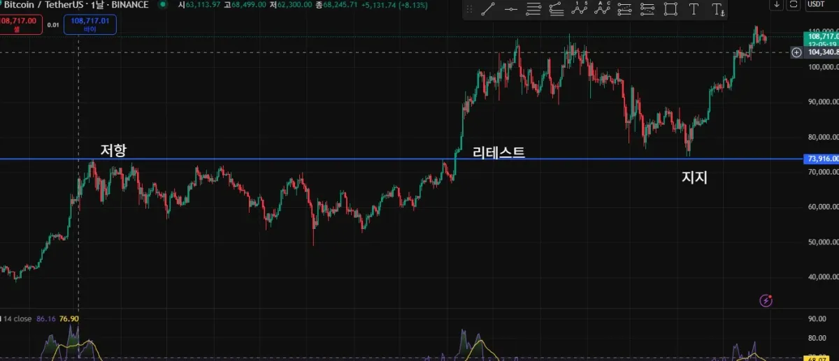 비트코인으로 지지,저항,리테스트를 확인해보았습니다. 차트는 날로 체크해서 했습니다.