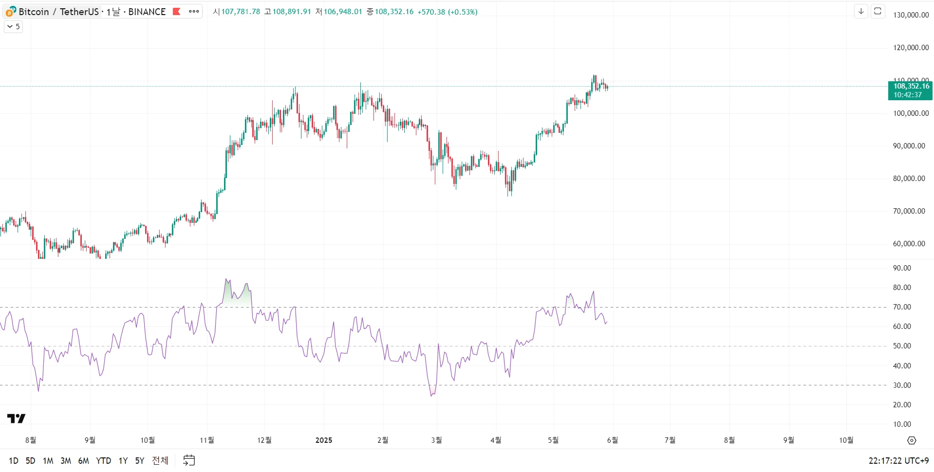 비트코인 1일 봉으로 봤을때 현재 rsi 과매수 구간에 진입했다가 살짝 빠지고있고 이럴땐 가격의 하락을 예상해 볼수 있습니다!