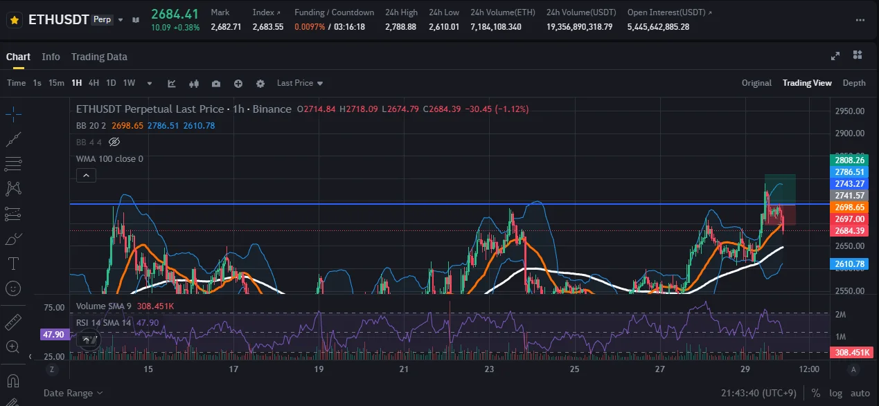 - 과매수 구간이지만 볼린저밴드를 강하게 뚫는 긴 양봉과 저항선 돌파로 롱 포지션 진입.