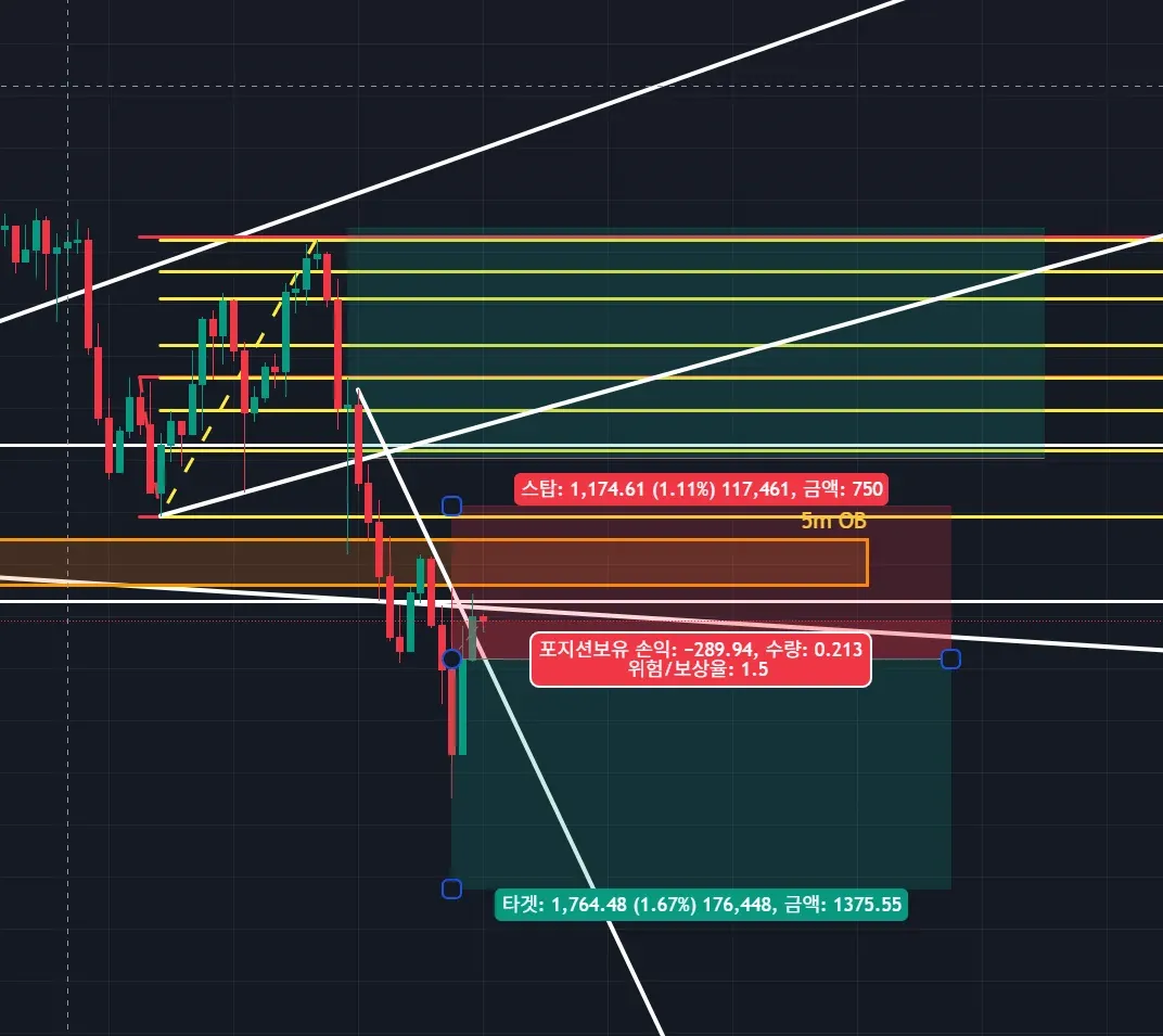 복기: 반등이 쌔서 하락추세선 위로 안착하였고 OB를 계속 건들길래 어 이거 손절 나가겠는데? 했지만.. 뭐 어떡해 그냥 흘러가는대로 놔두었더니. 하방 우선이라 알아서 떨어졌네요!
