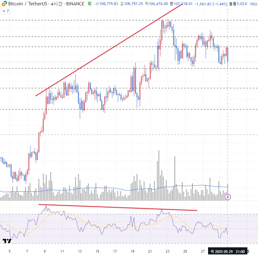 BTC 4시간 봉에서 다이버전스 발생 이후 가격 하락 발생