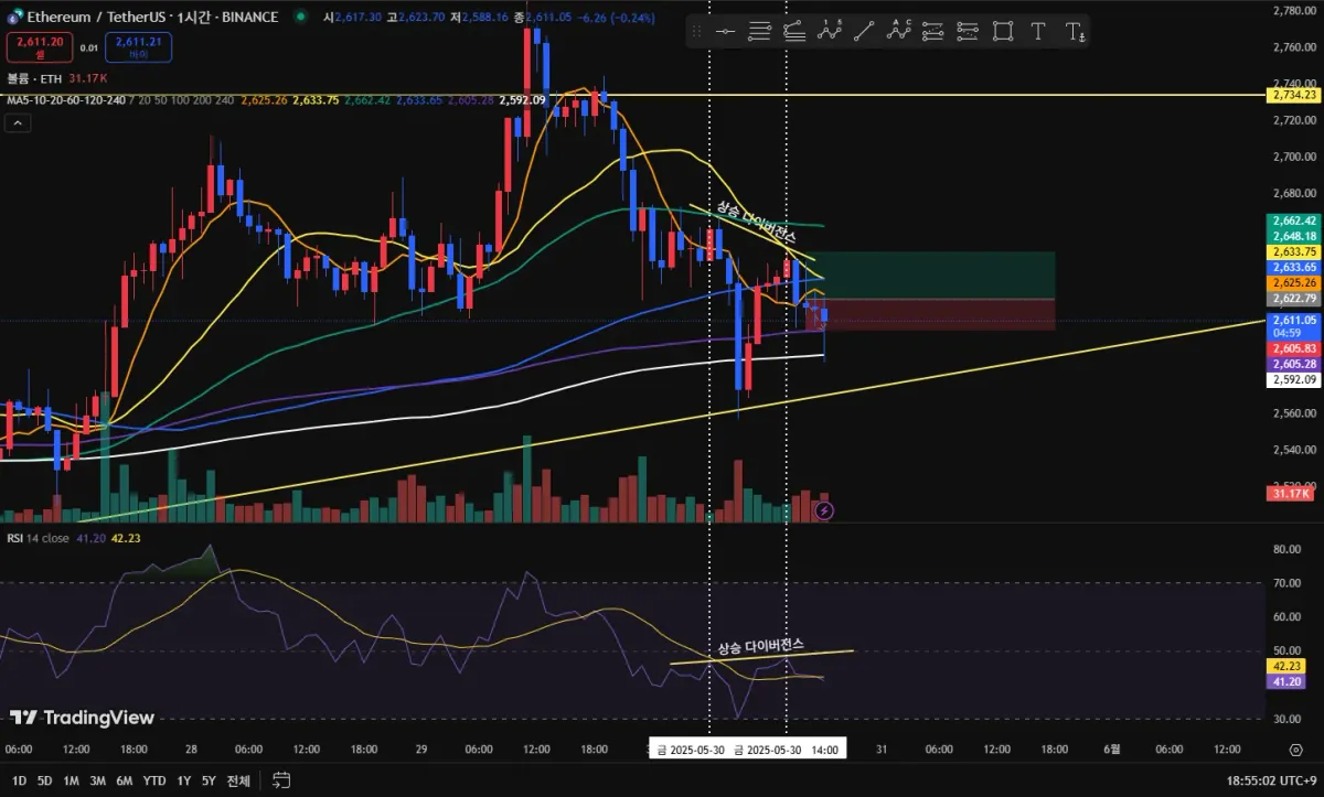 1. 1시간 봉 기준 RSI는 상승하고, 캔들은 낮아지는 상승 다이버전스 확인.