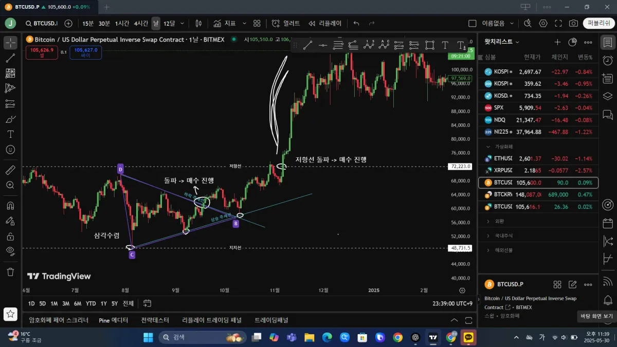--> 일봉 기준으로 비트코인을 봤을 때, 하락 추세선과 상승 추세선이 함께 쓰여 삼각수렴을 이루는 것을 확인했습니다. 물론 처음 접하다보니 의미있는 추세선이었을까 하는 작은 의구심이 들긴 합니다. 아무튼 상승 추세선이 지지 역할을 해주고 있고, 하락 추세선이 저항선 역할을 하고 있을 때 하락 추세선을 돌파하는 구간이 발생. 이후 약간의 상승세를 이어 타다가 실제 저항선을 돌파함에 따라 급상승.