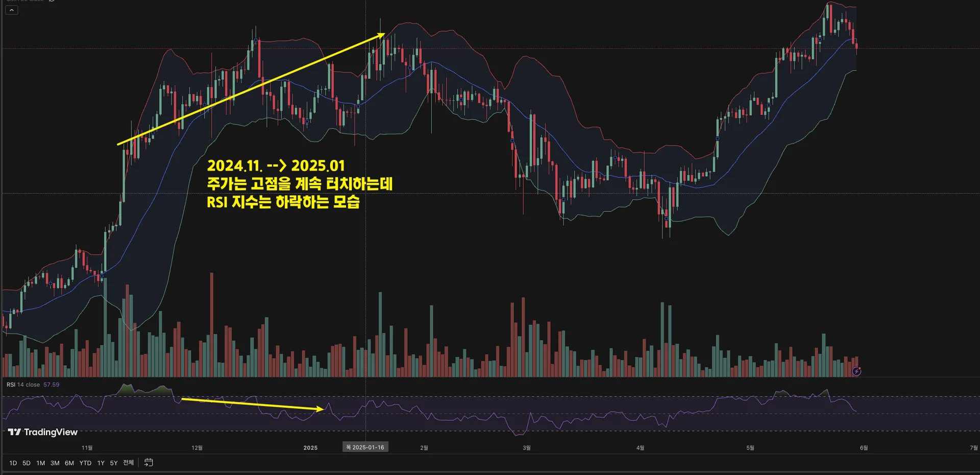주가는 신고가를 갱신하였지만 RSI지수는 직전 고가 대비 하락한 모양으로 나타남