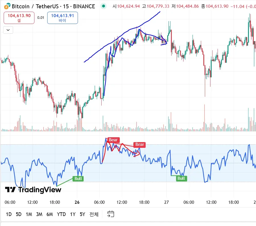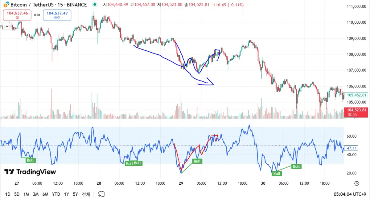 RSI지수를 추가하고 나름대로 하락과 상승을 분석해보았습니다.