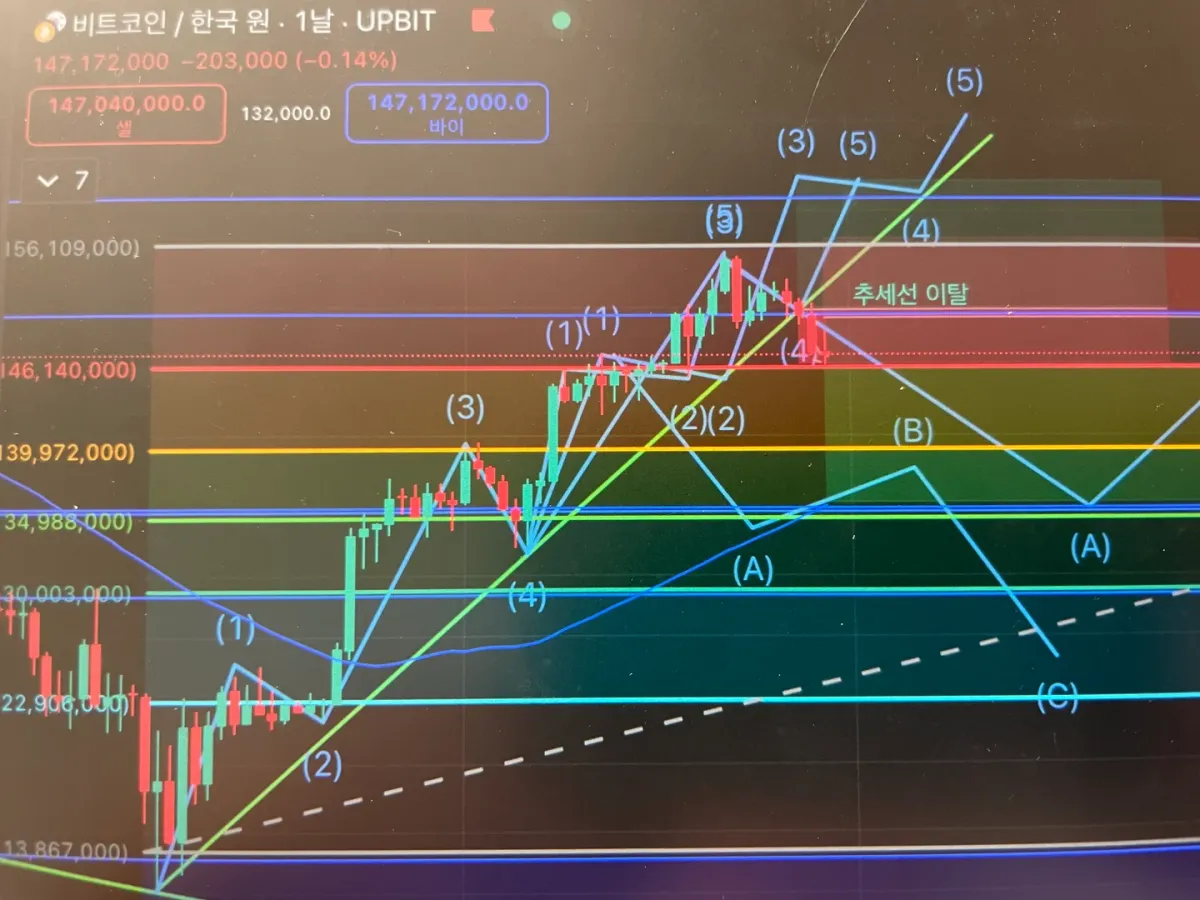 비트코인 일봉 상 추세선 이탈 확인 후