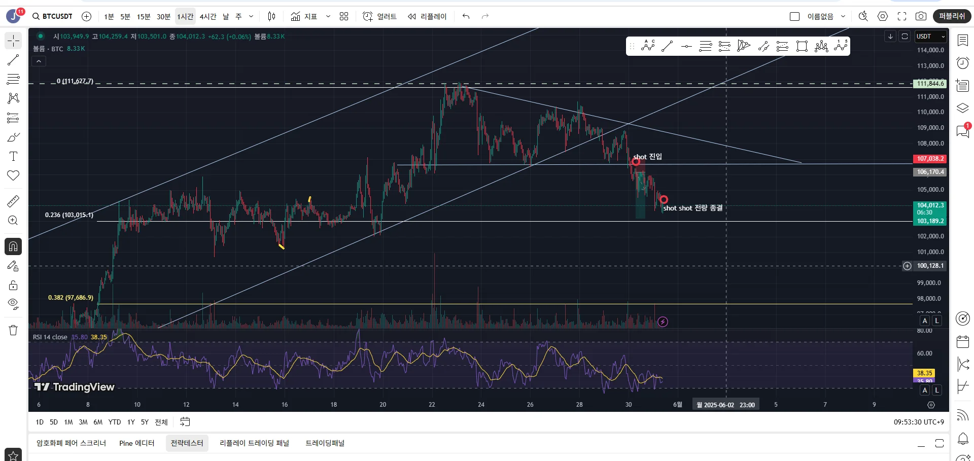 디센딩 트라이앵글 지지선 돌파후 재하락시 shot 진입.