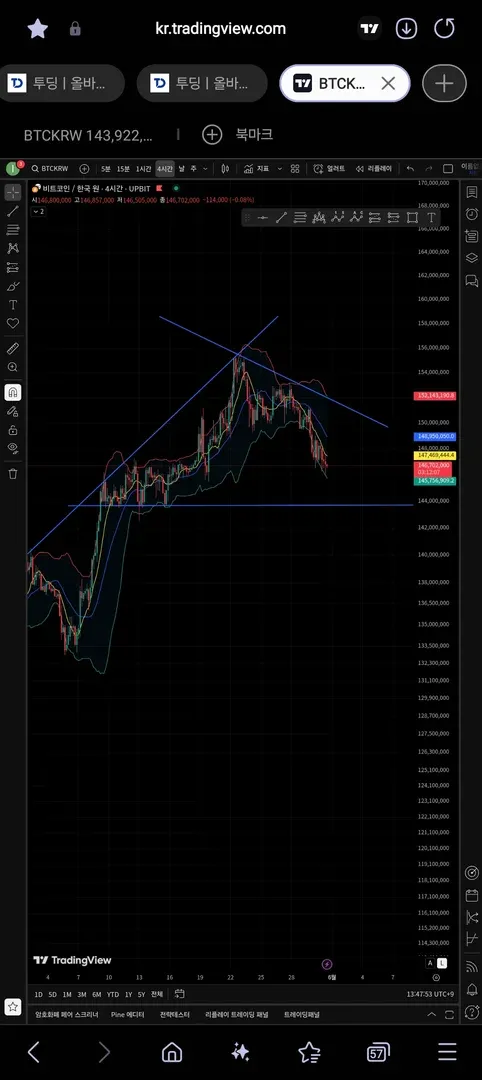 일단 제가 생각한 것은 우측 선을 기준으로 쭉 올라가거나 내려갈것이라고 예측하였습니다. 근데 외쪽 선은 이후에 그은 선으로써 선보다 더 아래로 내려오는 상황이 되었습니다. 이런 상황을 봤을때 아래 가로 선을 기준으로 치고 올라갈 것이라고 조심스런 예상을 해보았습니다.