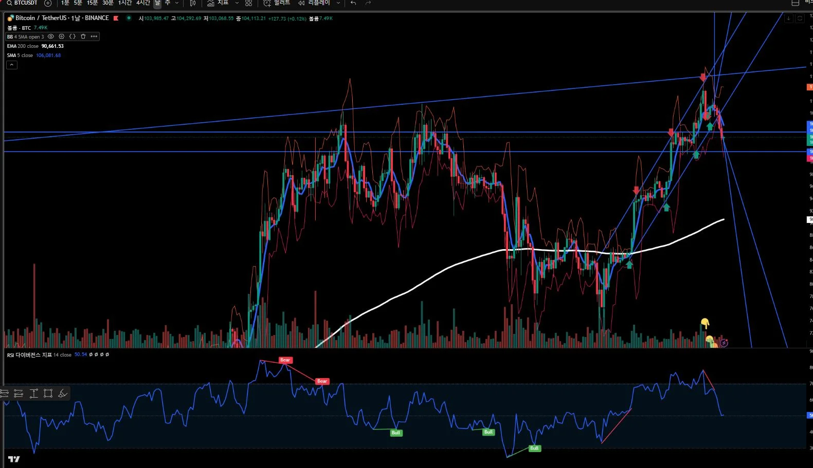 정확히 다이버전스 찾기가 쉽지가 않지만 일봉 차트상 현재는 고점이 낮아지면서 하락 다이버전스 출현으로 당분간 조정장으로 예상합니다.