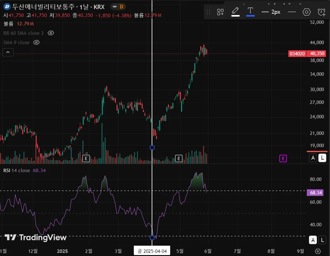 요새 보고 있는 두에빌 주식으로 해봤습니다 ㅎㅎ 4월 4일 양봉으로 마감하였으나 rsi는 떨어져 곧 하락이 발생할 것을 예측할 수 있었습니다.