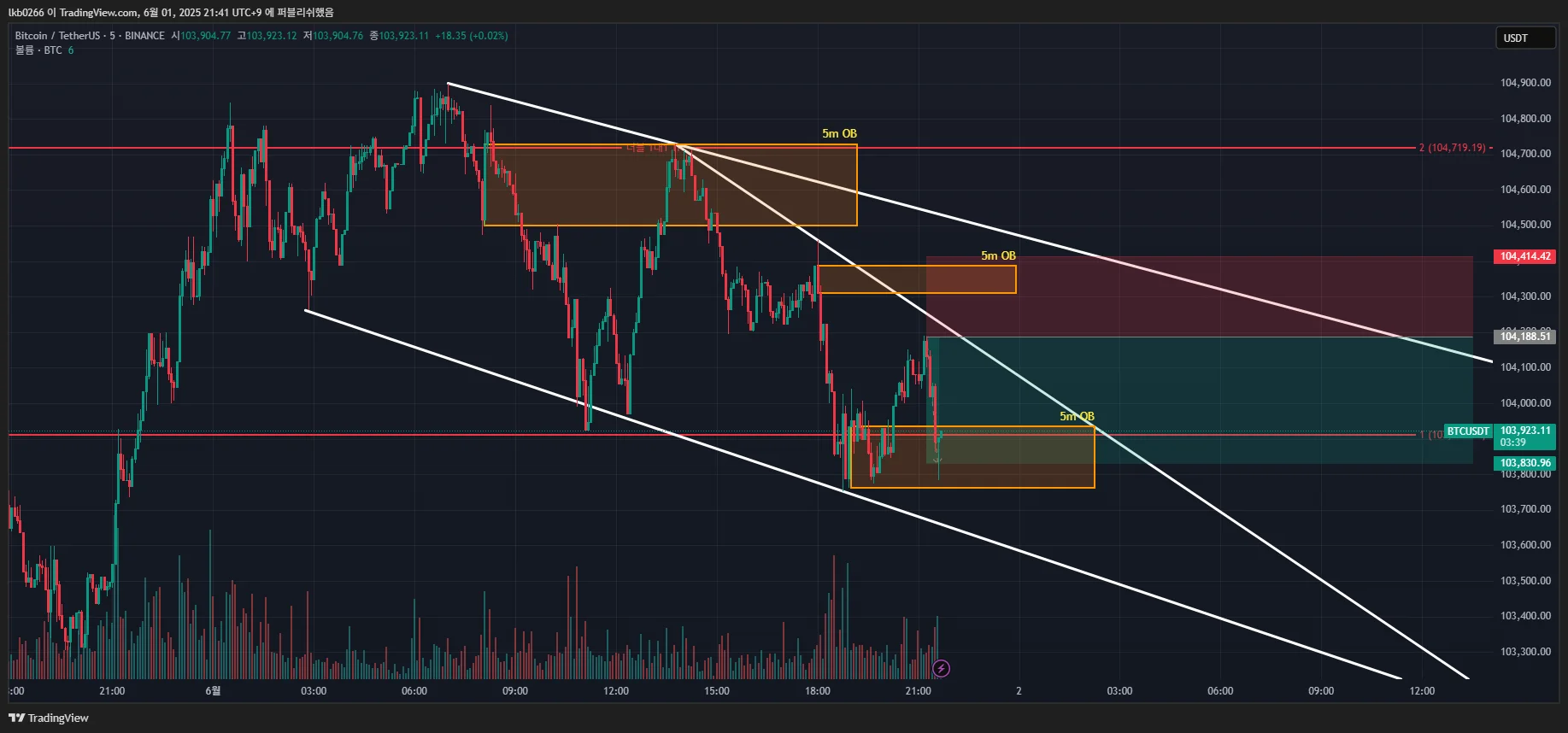 -뚜렷한 것 없이 하락 쐐기형으로 내려가고 있기에 짧은 봉으로 트레이딩 해볼까 싶어서 처음으로 5m OB를 긋고 트레이딩을 진행하였다.