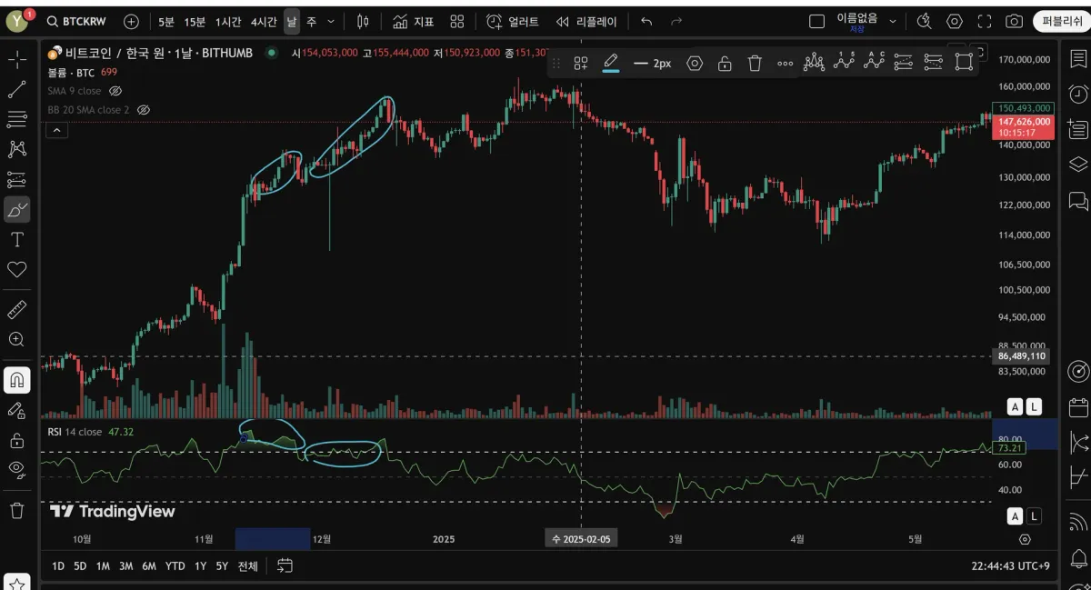 계속 상승중인 그래프와는 달리 rsi는 전체적으로 하락하거나 횡보하는 모양을 보여줘서 다이버전스라고 추정했습니다.