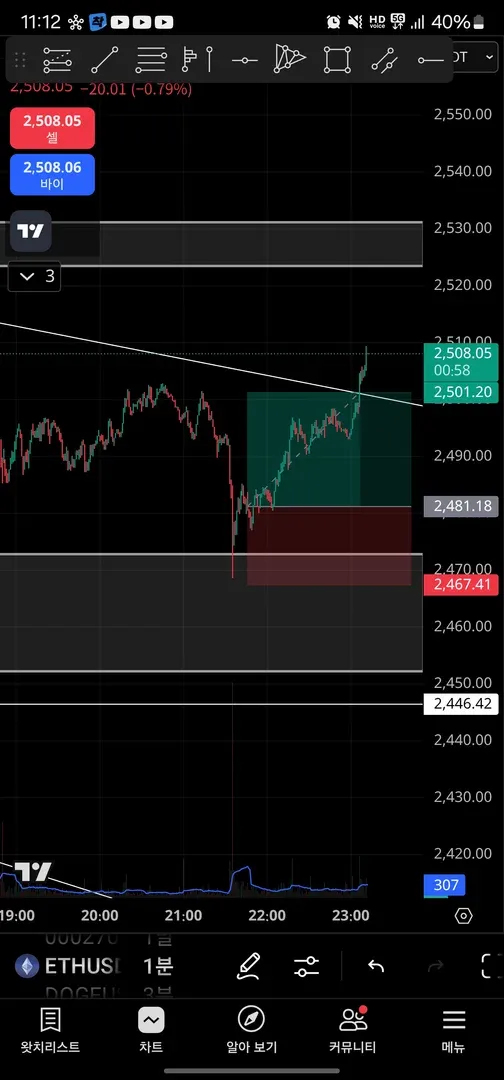 2) 추세선까지 저항맞고 하락추세 지속 또는 상단 ob맞고 박스권이라는 시나리오 2개를 생각