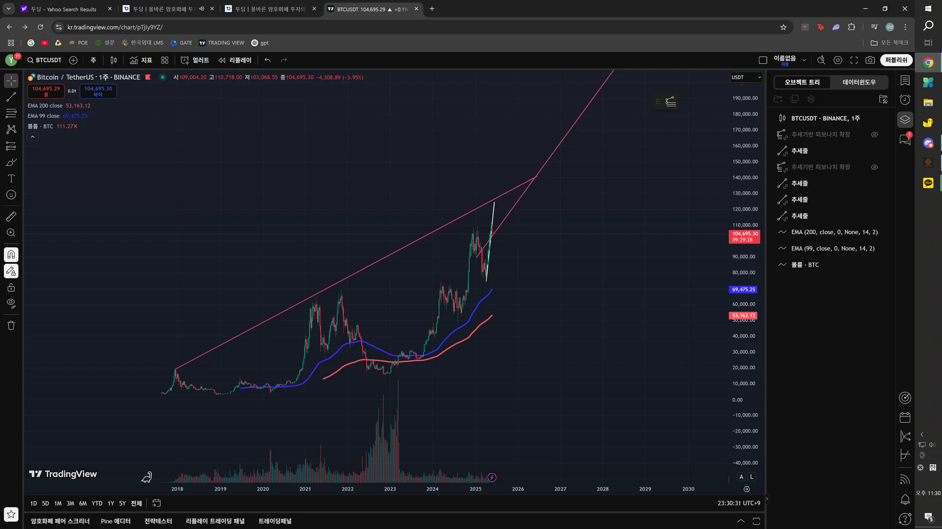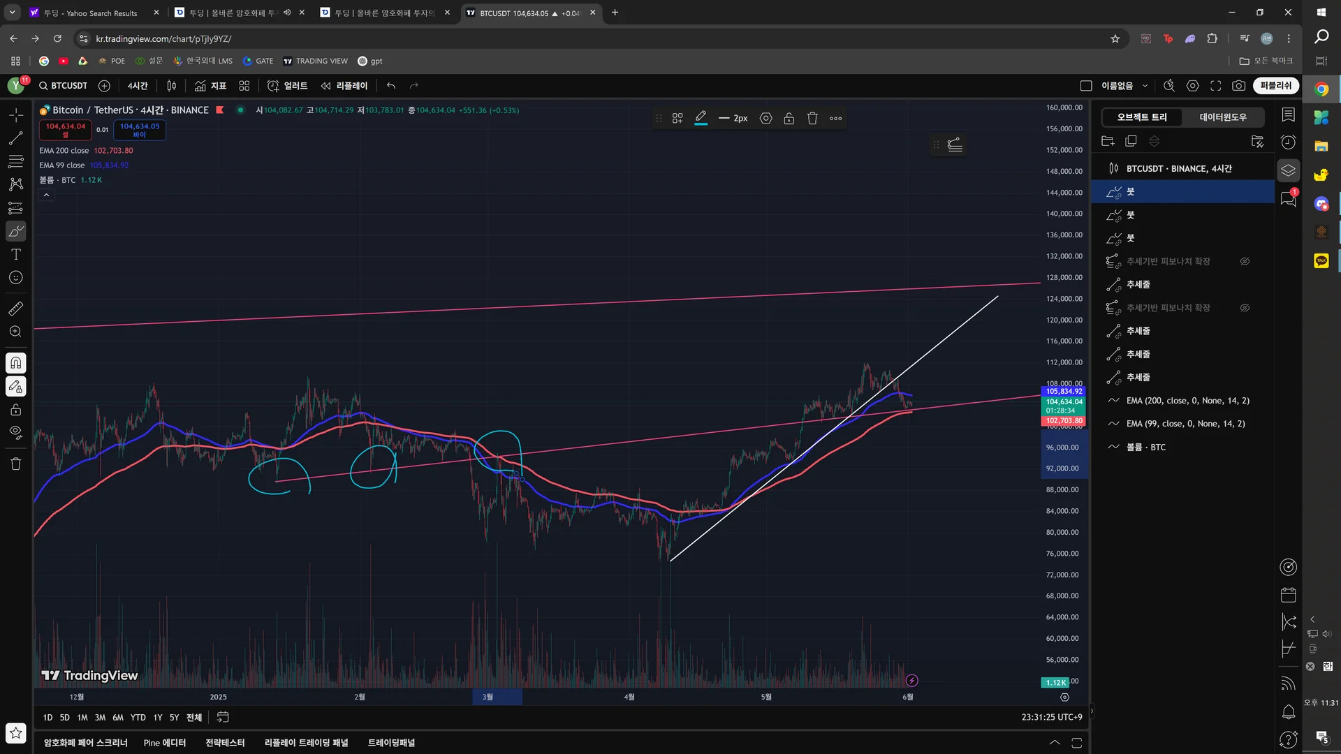 이를 토대로 이번 하락의 지지 가능성을 103까지 잡은 후 빗각 근처에 다가올 때 롱 포지션에 진입하였습니다.