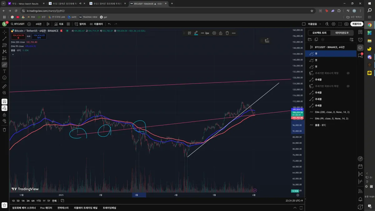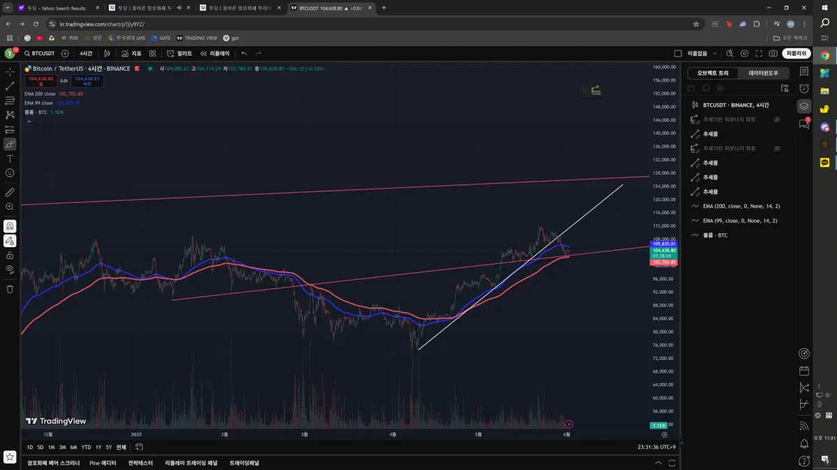이를 토대로 이번 하락의 지지 가능성을 103까지 잡은 후 빗각 근처에 다가올 때 롱 포지션에 진입하였습니다.